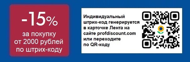 - 15% НА ТОВАРЫ ПРИ ПОКУПКЕ ОТ 2000 РУБЛЕЙ ПО ИНДИВИДУАЛЬНОМУ ШТРИХ-КОДУ.