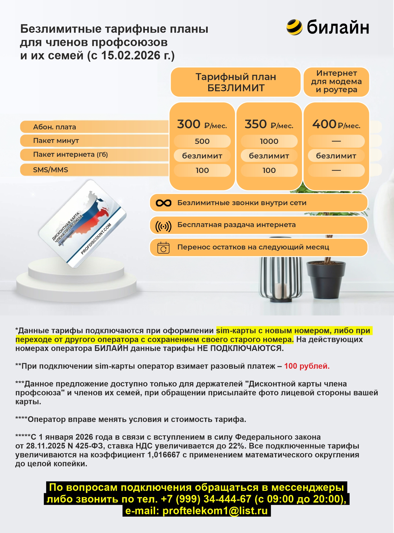 С 1 января 2026 года в связи с вступлением в силу Федерального закона от 28.11.2025 N 425-ФЗ, ставка НДС увеличивается до 22%. Все подключенные тарифы увеличиваются на коэффициент 1,016667 с применением математического округления до целой копейки.