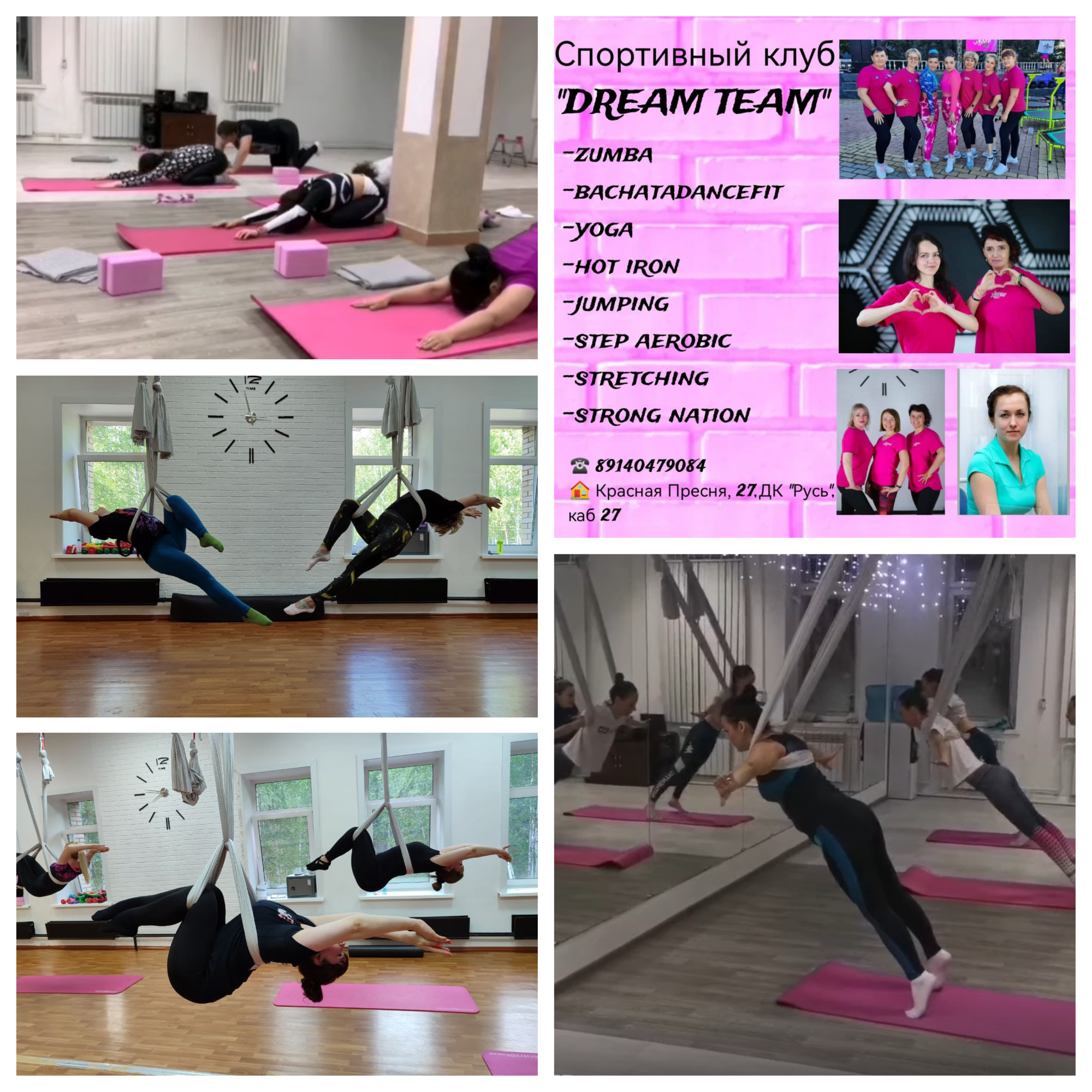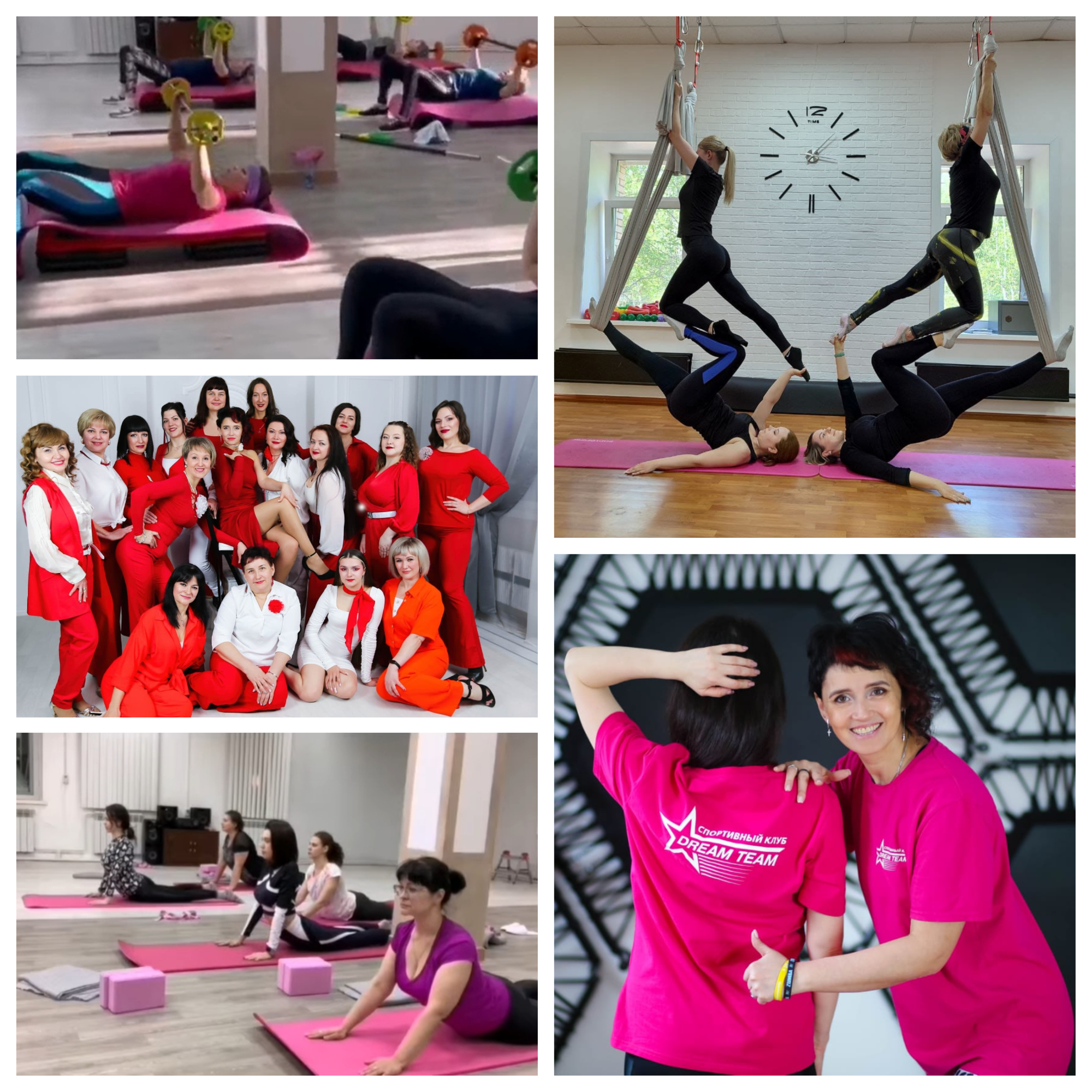 Спортивный клуб "DREAM TEAM" предлагает групповые занятия по следующим направлениям фитнеса: ZUMBA FITNESS (танцевальная кардиотренировка на основе латиноамериканских ритмов); HOT IRON (силовая тренировка с мини-штангами); FLY YOGA (йога в гамаках, сочетающая в себе элементы пилатеса, гимнастики и традиционной йоги); STRONG NATION (высокоэффективная функциональная тренировка, использующая только вес собственного тела); STRETCHING VOD (тренировка, направленная на улучшение гибкости тела, подвижности суставов, использующая сочетание динамических и статических упражнений); STEP AEROBIC (кардиотренировка на основе аэробики, в которой движения выполняются с применением степ-платформы); YOGA (древние практики, состоящие из асан, дыхательных техник и медитаций).