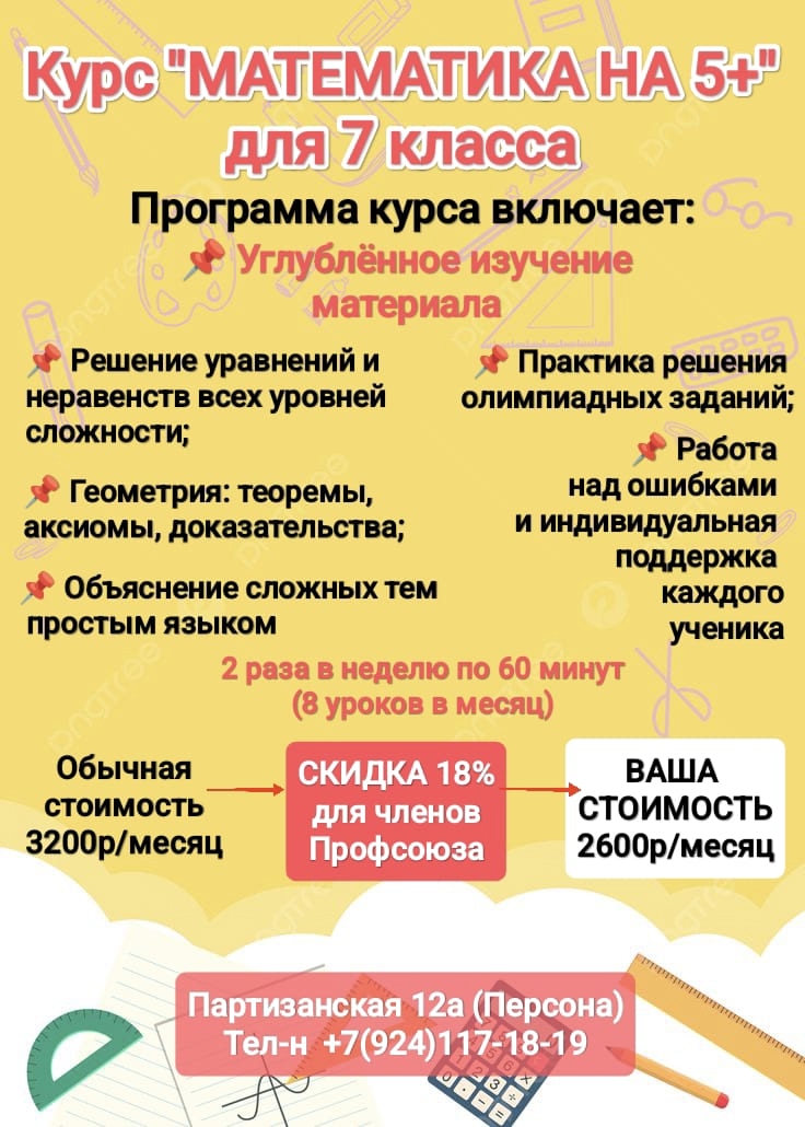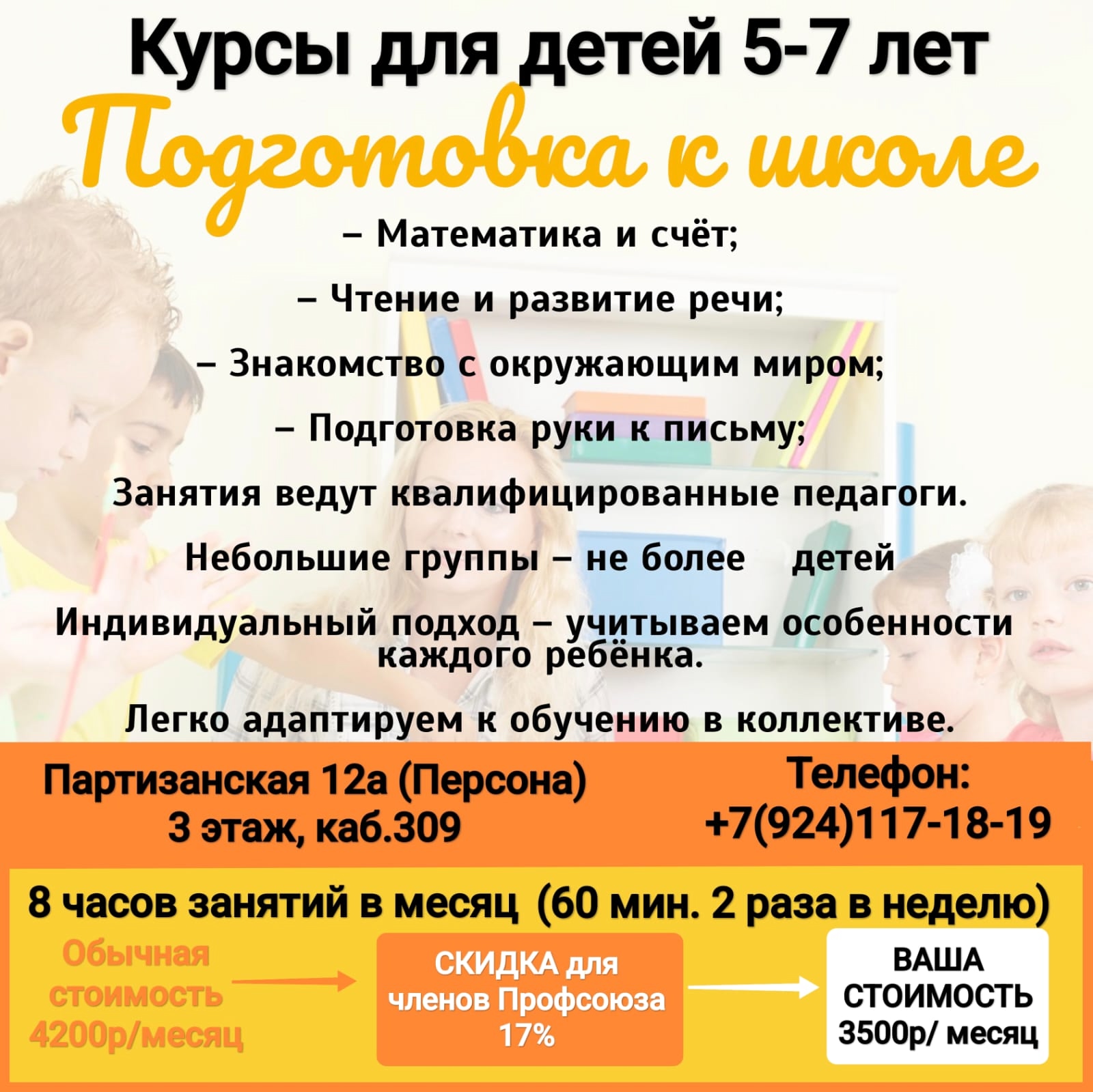 *Скидка по дисконтной карте члена профсоюза 17% от обычной стоимости за месяц. Скидка не суммируется с другими скидками и акциями. Скидка предоставляется членам семьи (супруги, родители, дети).